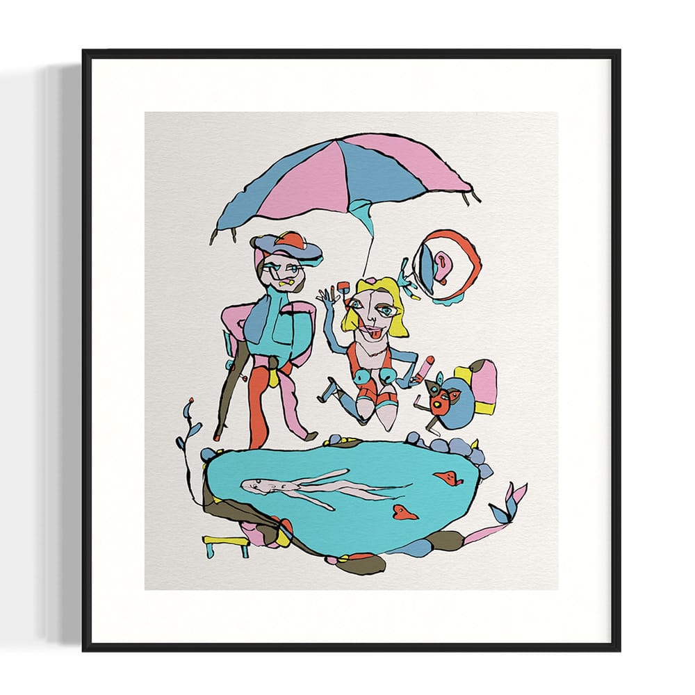 In Surprise by the Garden Pond, Puha turns a casual summer scene into a surreal theatre of colour and character. The drawing-based composition mixes innocence and absurdity — figures lounge, float and interact under pastel skies, their gestures balancing between humour and desire. The work belongs to Puha’s ongoing series of hand-drawn graphic pieces exploring fantasy, intimacy and human oddity.